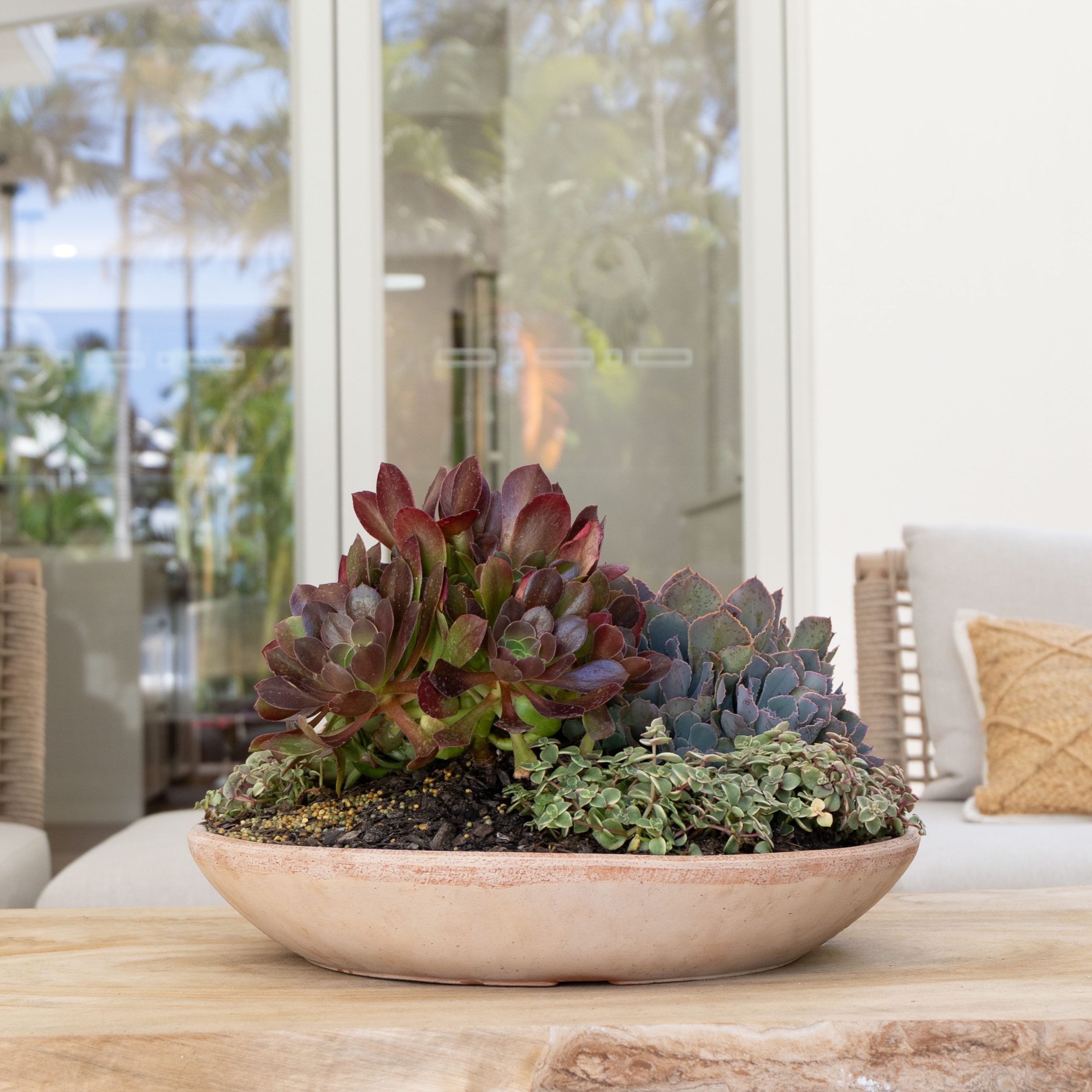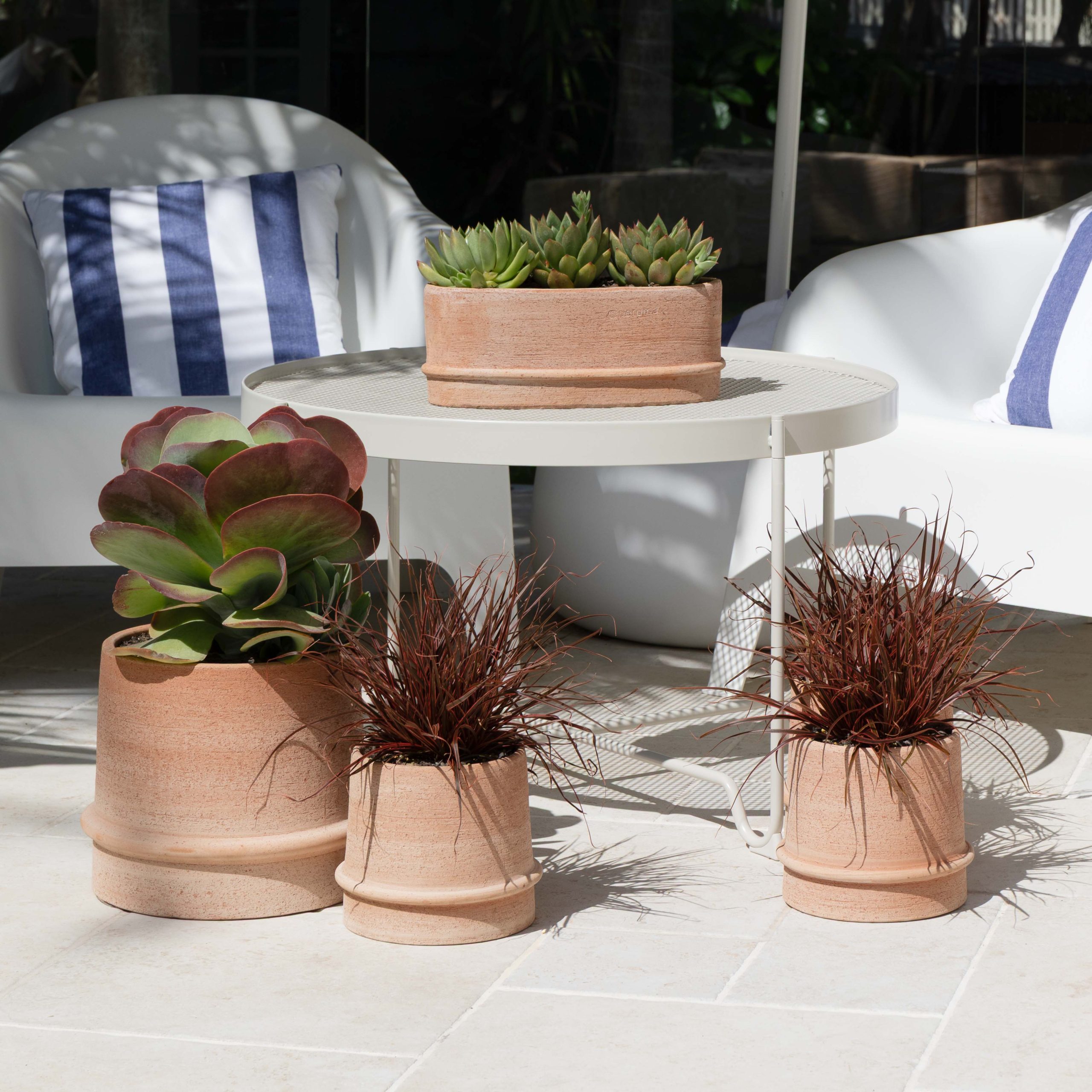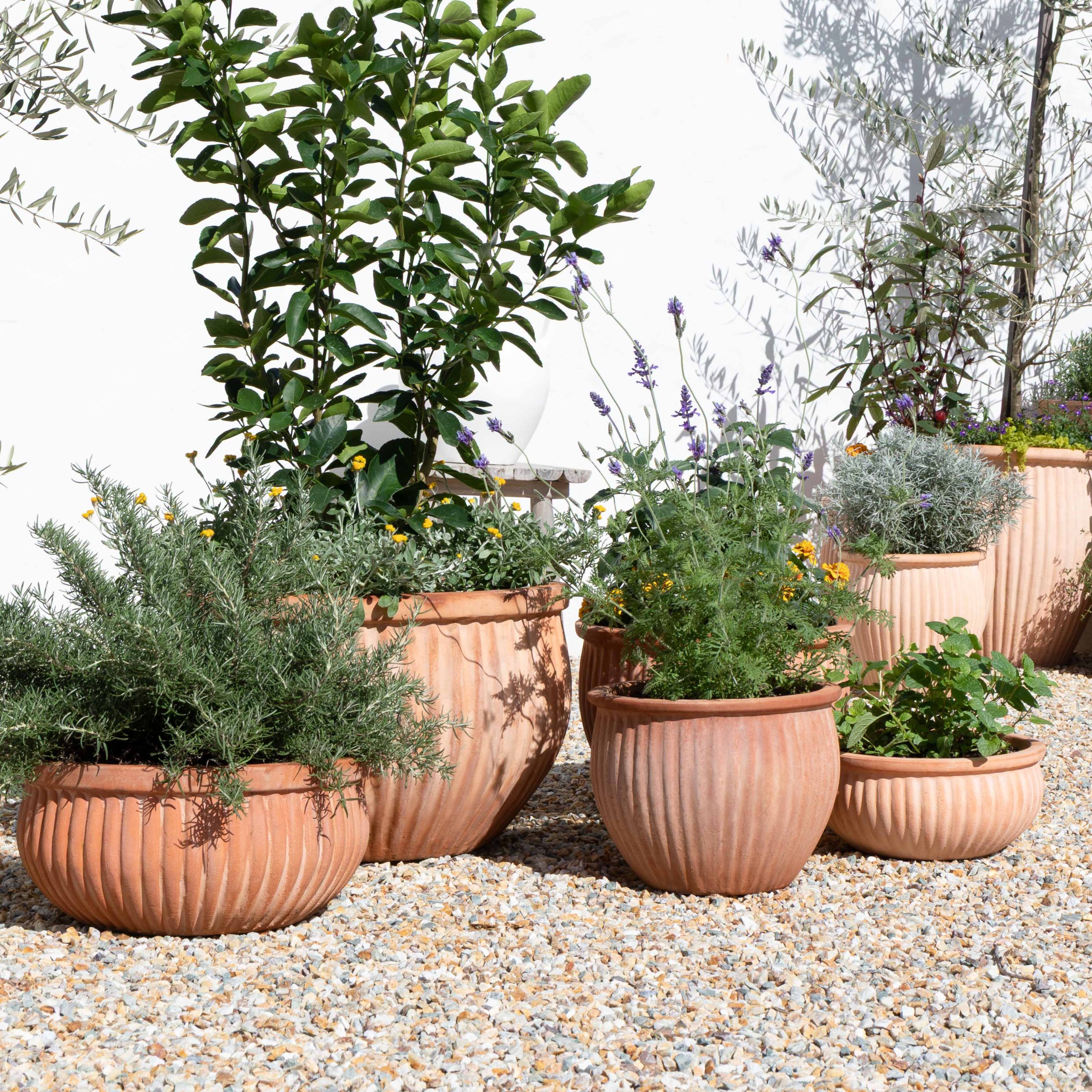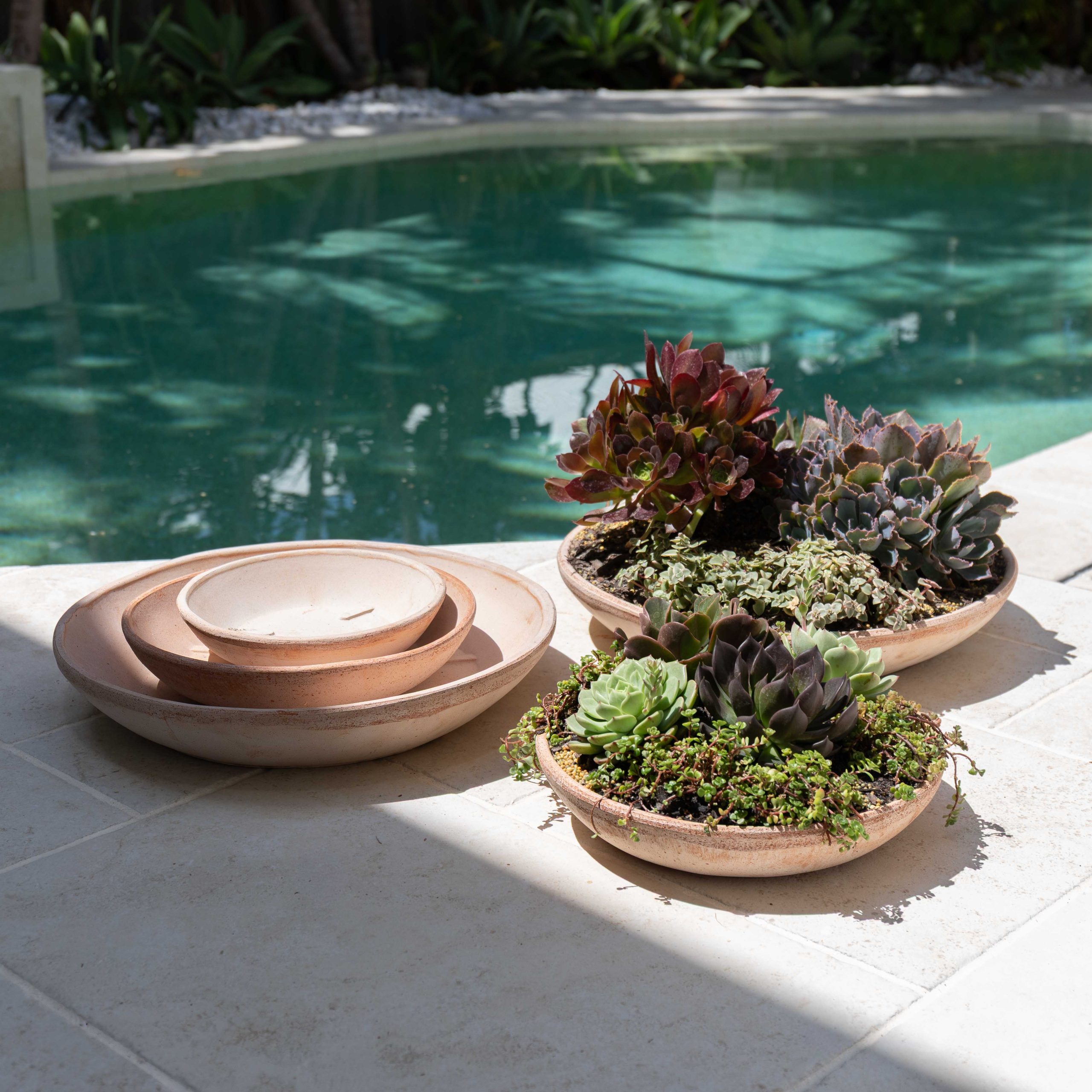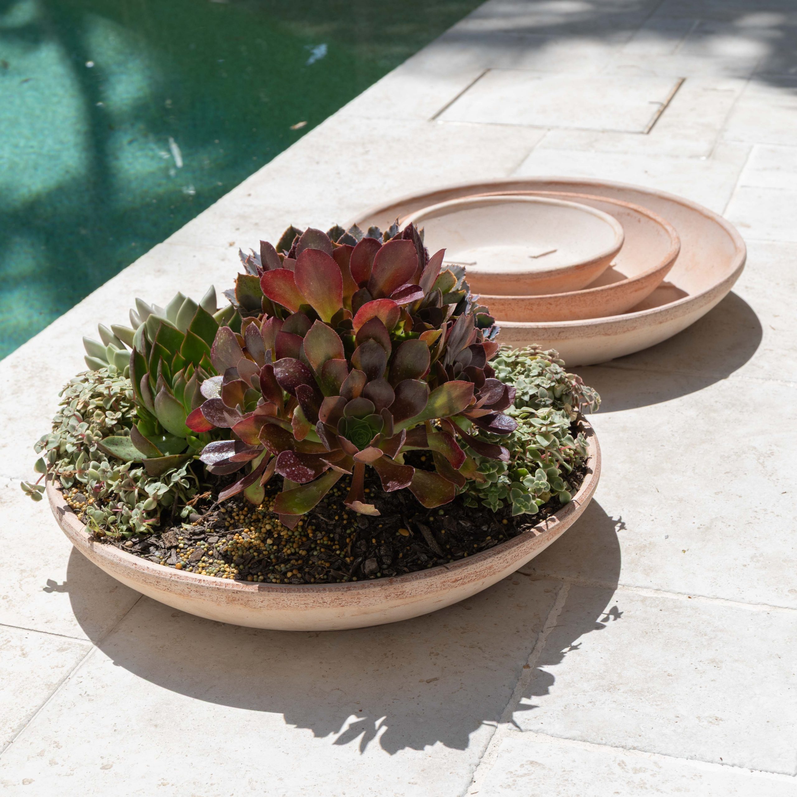 The Alto wide low bowl are perfect for outdoor table succulent bowl arrangements. From three sizes to choose from, these textured bowls are made from breathable and water-resistant terracotta. Drainage holes not included.