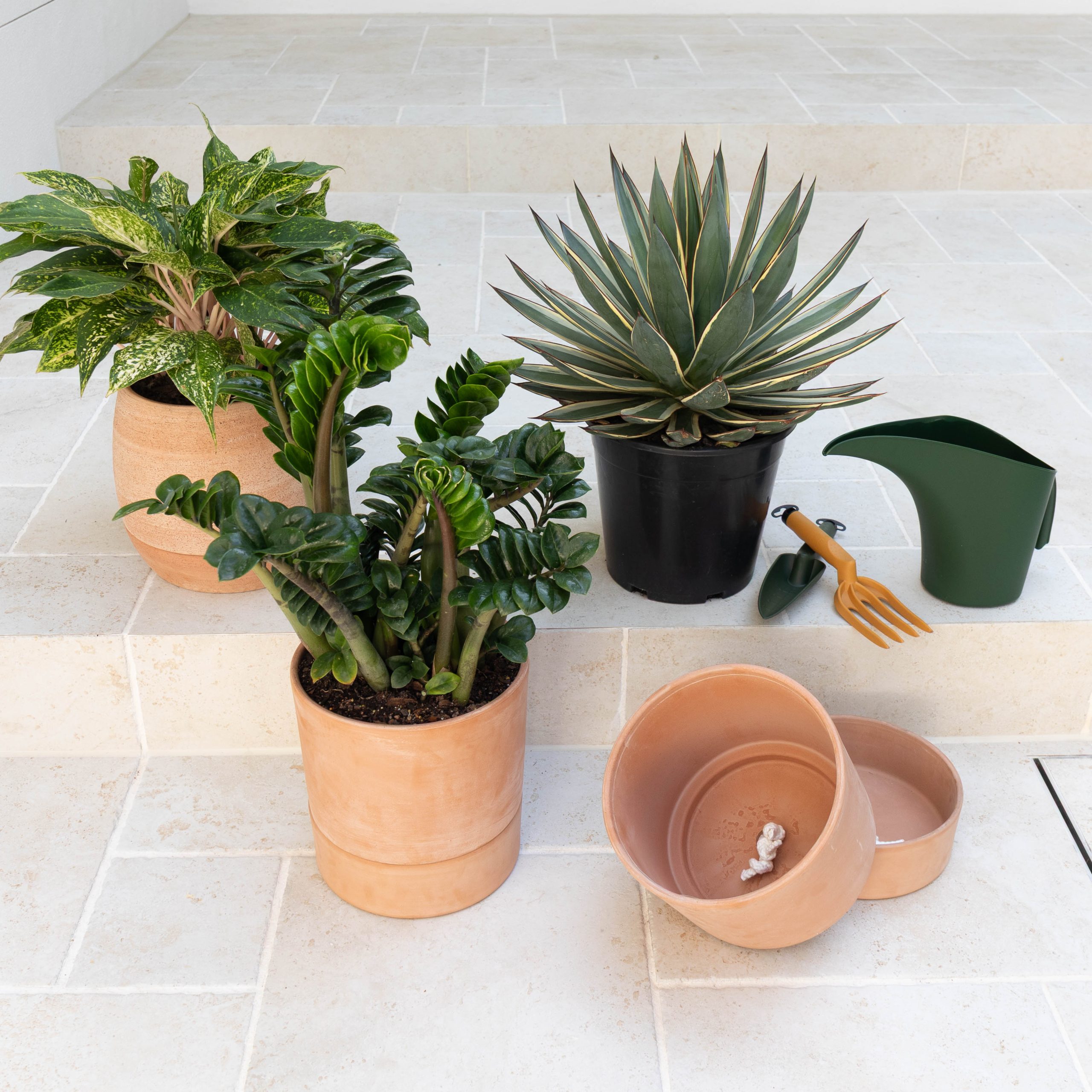 This natural terracotta water reserve vase and bowl set can use a cotton wicking system thread through a hole between vase and bowl. Capillarly action then draws water from the water-filled bottom bowl via the wick to water the potted plant above allowing for self-watering to take place.