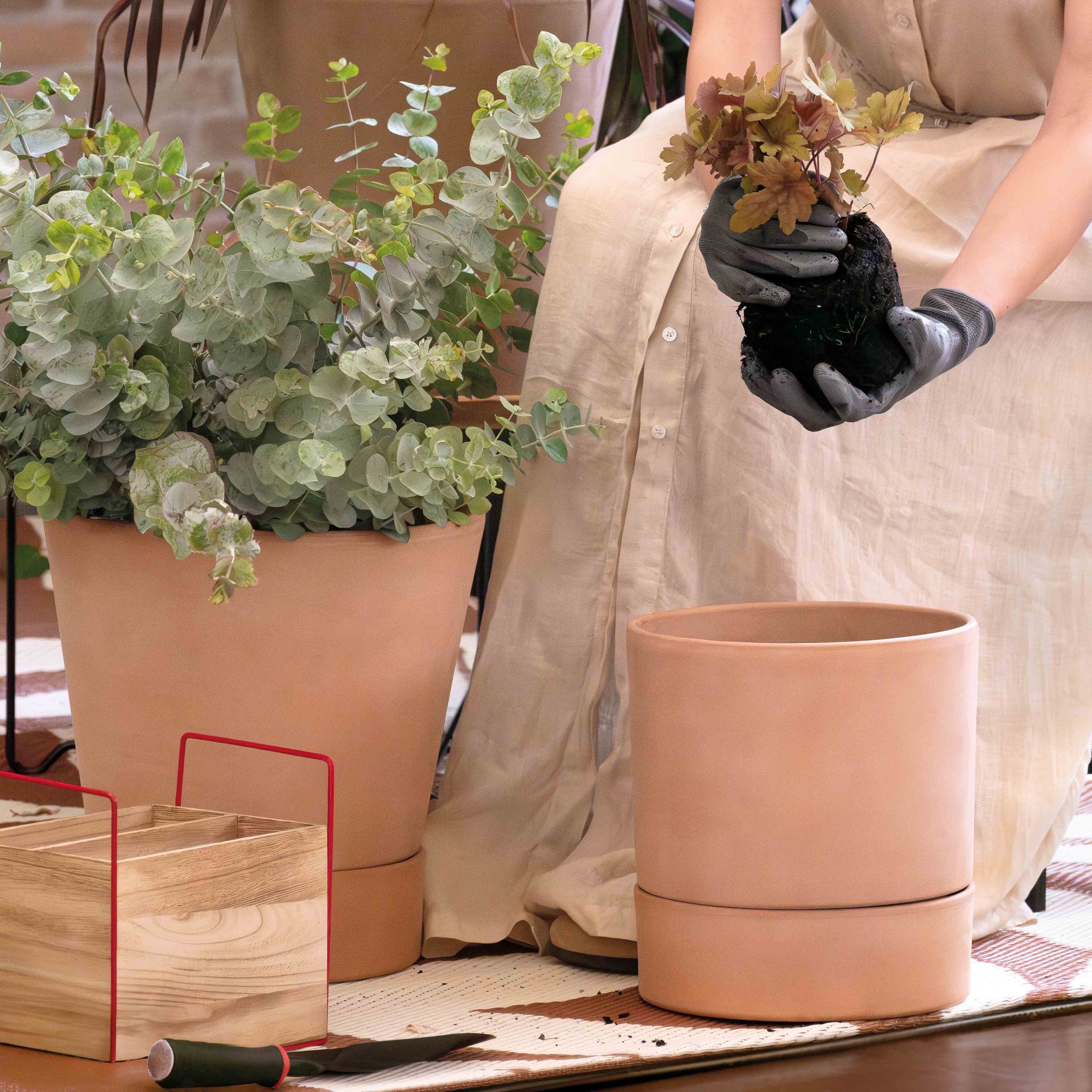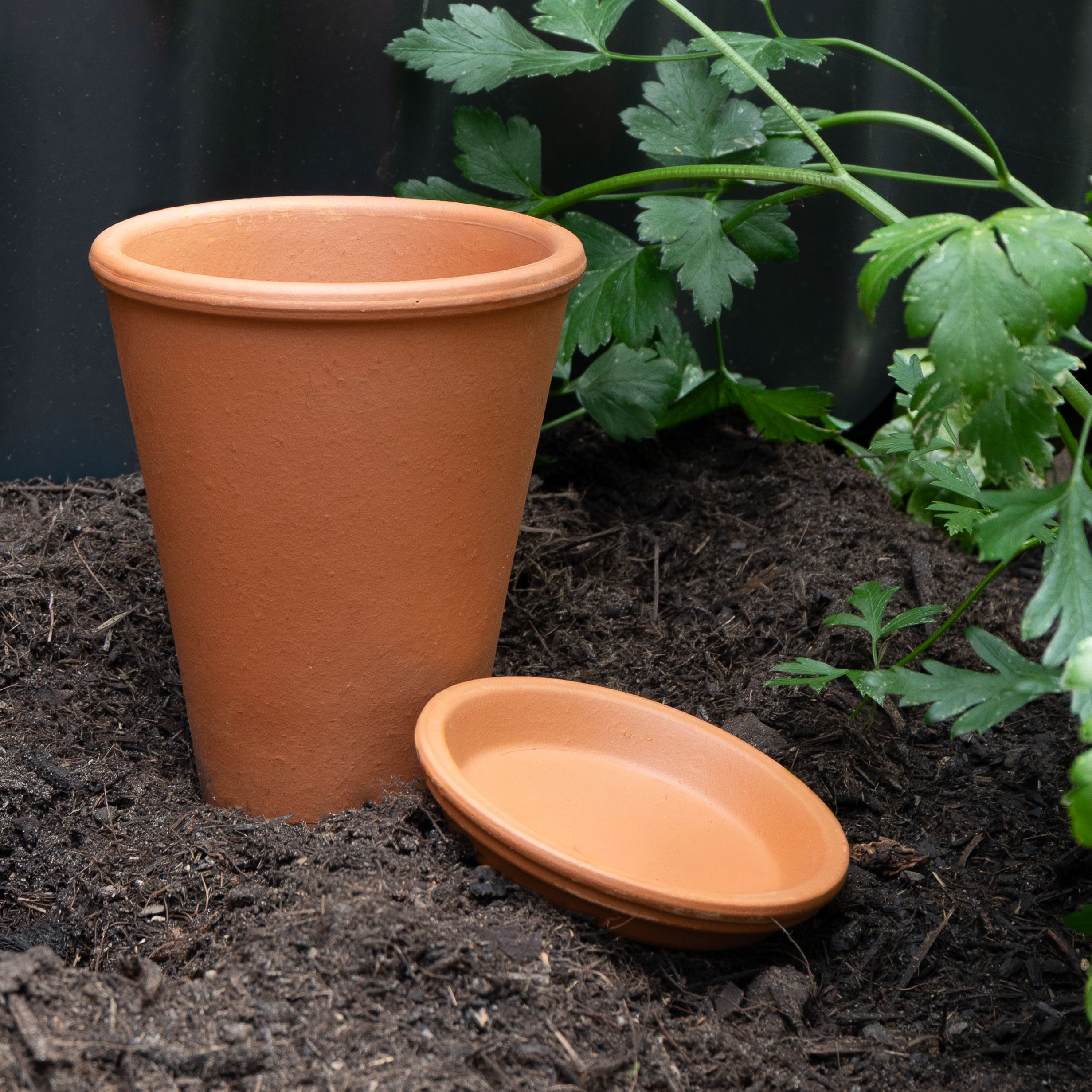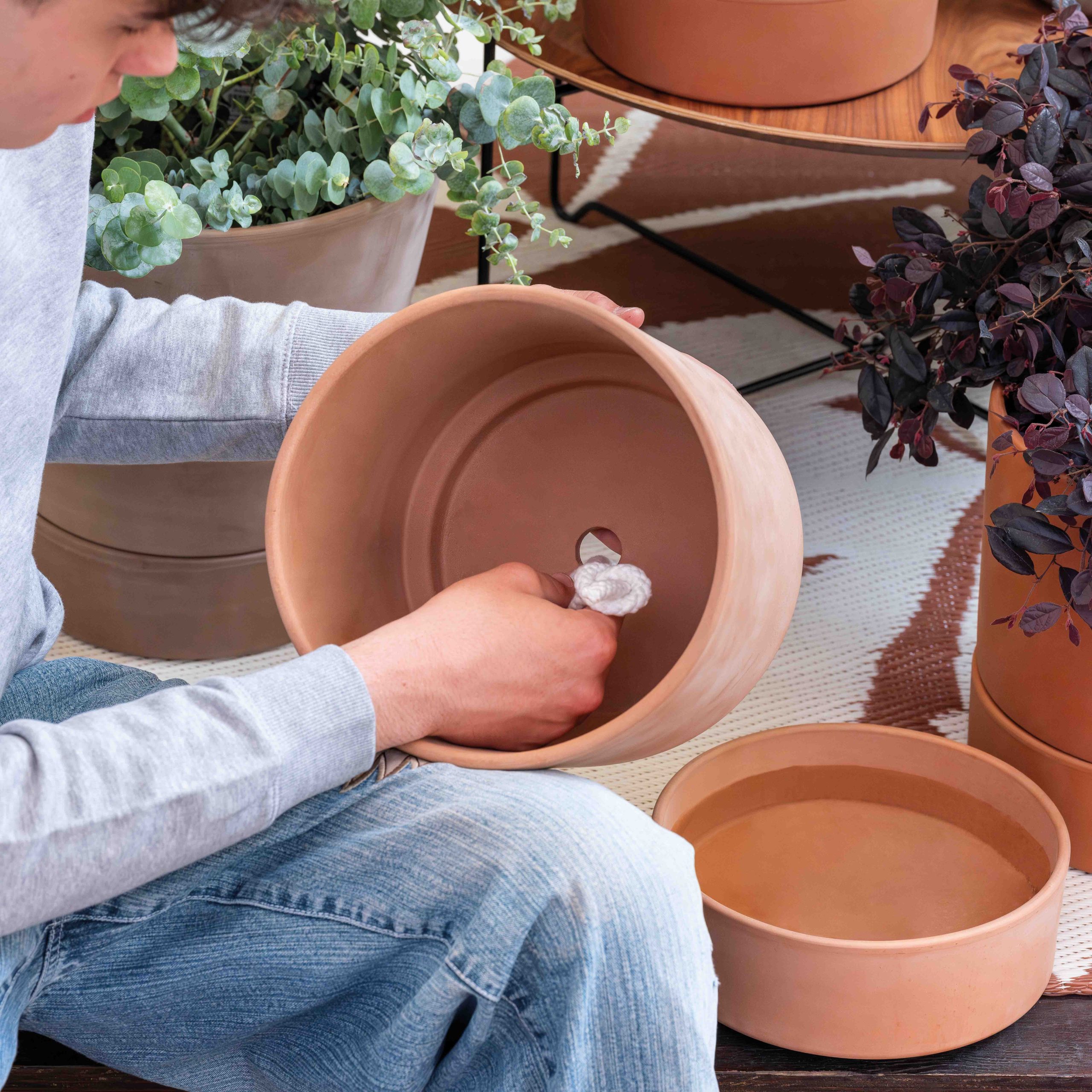Made in Italy, the Modul๏ฟฝO kit is made up of a Cone Pot and Bowl. This natural terracotta water reserve cylinder and bowl set can use a cotton wicking system thread through a hole between vase and bowl. Capillarly action then draws water from the water-filled bottom bowl via the wick to water the potted plant above allowing for self-watering to take place.