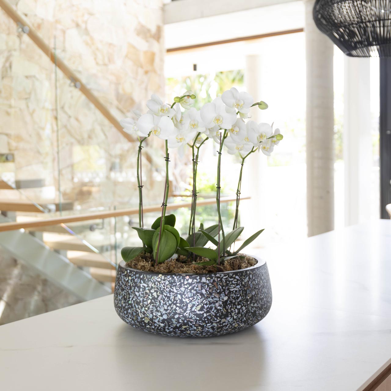 Non-Self Watering The stunning Vernazza Collection includes tabletop, floor-standing and hanger shapes and an be used for indoor or outdoor. It exudes elegance and class with its unique inclusion of crushed seashells.