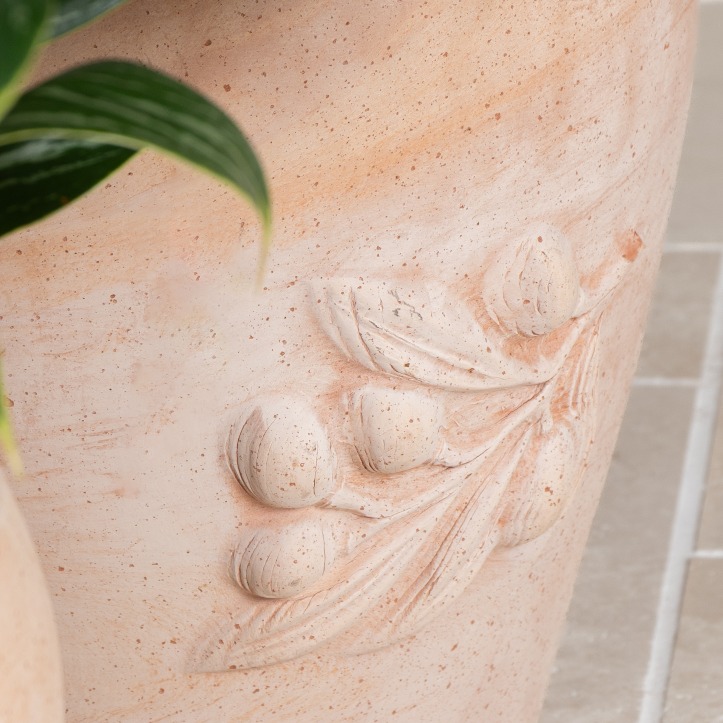 The Siena Olive terracotta pots with beautiful olive branch motif are handcrafted in Italy out of natural Galestro clay from the hills of Tuscany.